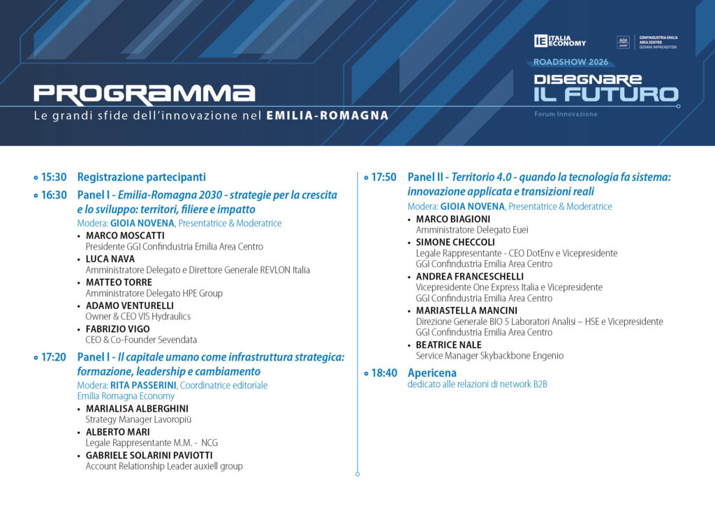 Dopo le tappe che hanno coinvolto diverse regioni italiane, il roadshow Disegnare il futuro arriva in Emilia-Romagna con un appuntamento dedicato ai temi della competitività territoriale, del capitale umano e dell’innovazione applicata. La terza edizione del forum si terrà il 22 aprile 2026 alle ore 16:30 presso la sede di HPE Group a Modena, confermando il format di confronto tra imprese, istituzioni e professionisti promosso da Italia Economy. L’evento è gratuito con registrazione: www.eventbrite.it.